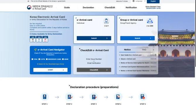 自 2026 年起,韓國正式推動「電子入境卡(e-Arrival Card)」制度,外國旅客可在入境前 72 小時內線上申報,完全免費。完成後,資料將直接連結護照系統,入境時無須出示畫面,由移民官查詢即可;若未提前申請,仍可改填紙本入境卡。